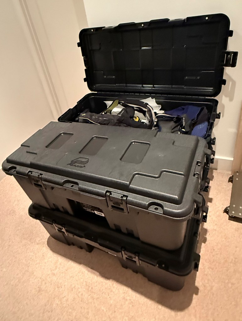 I’ve got 10x the Gorilla Large Storage Trunk, which has about 100L – 120L of usable storage space, at c. £55 each plus 6x Sportsman Medium Storage Trunk, which has about 60L – 80L of usable storage space, at just under £40 each.